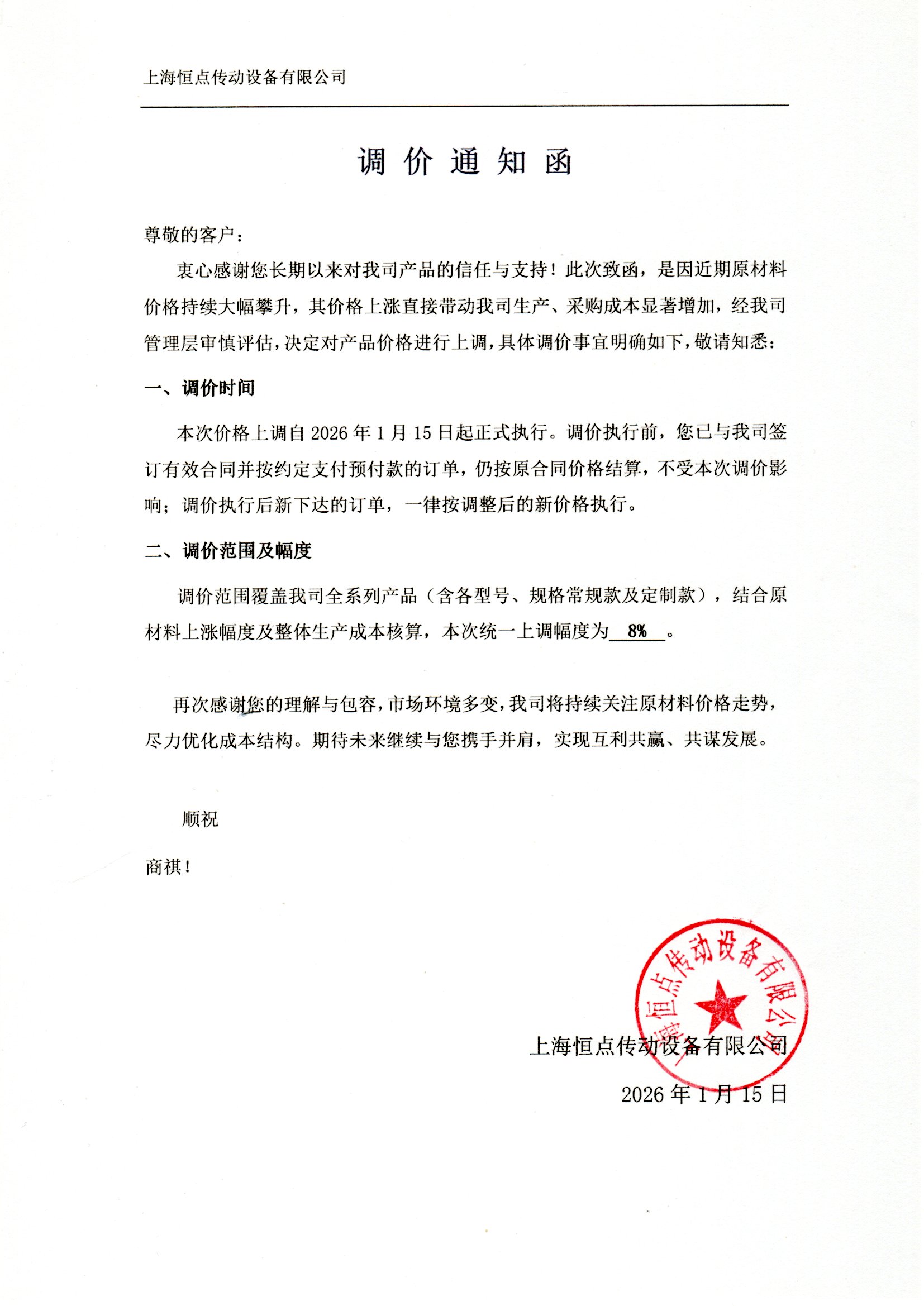 本次價格上調自2026年1月15日起正式執行。調價執行前,您已與我司簽訂有效合同並(bìng)按約定支付預付款的訂單,仍按原合同價格結算,不受本次調價影響;調價執行後新下達(dá)的訂單,一律按調整後的新價格執行。