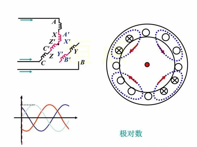 如果A、B、C三相繞組每相分别由兩個線圈串聯組成,每個線圈的跨距爲1/4圓周,那麽三相電流所建立的合成磁場仍然是一個旋轉磁場,並(bìng)且電流變(biàn)化一次,旋轉磁場僅轉過1/2轉,這就是2對極。同理,如果将繞組按一定的規則排列,可得3對極、4對極或一般地說P對極。P就是極對數。
