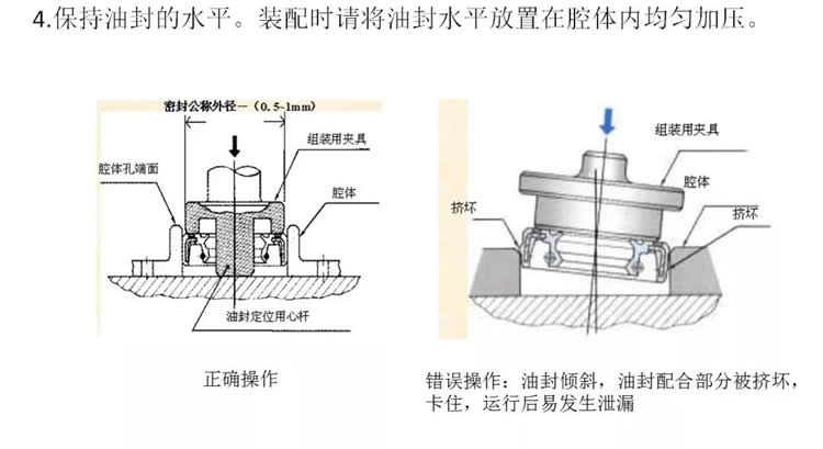 2.油封要平裝 ,不能有傾斜的現象。建議採(cǎi)用油壓設備(bèi)或套筒工具安裝。壓力不要太大,速度要均勻 、要慢。