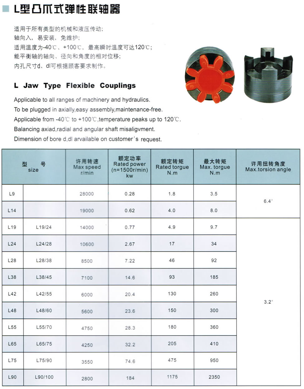 L型凸爪式彈性聯軸器适用於所有類型的機械和液壓傳動;軸向入,易安裝,免維 護;适用溫度爲-40度 ,+100度,最高瞬時溫度可達120度; 能平衡軸的軸向 ,徑向和角度的相對位移;内孔尺寸d,d1可 根據顧客要求制作。