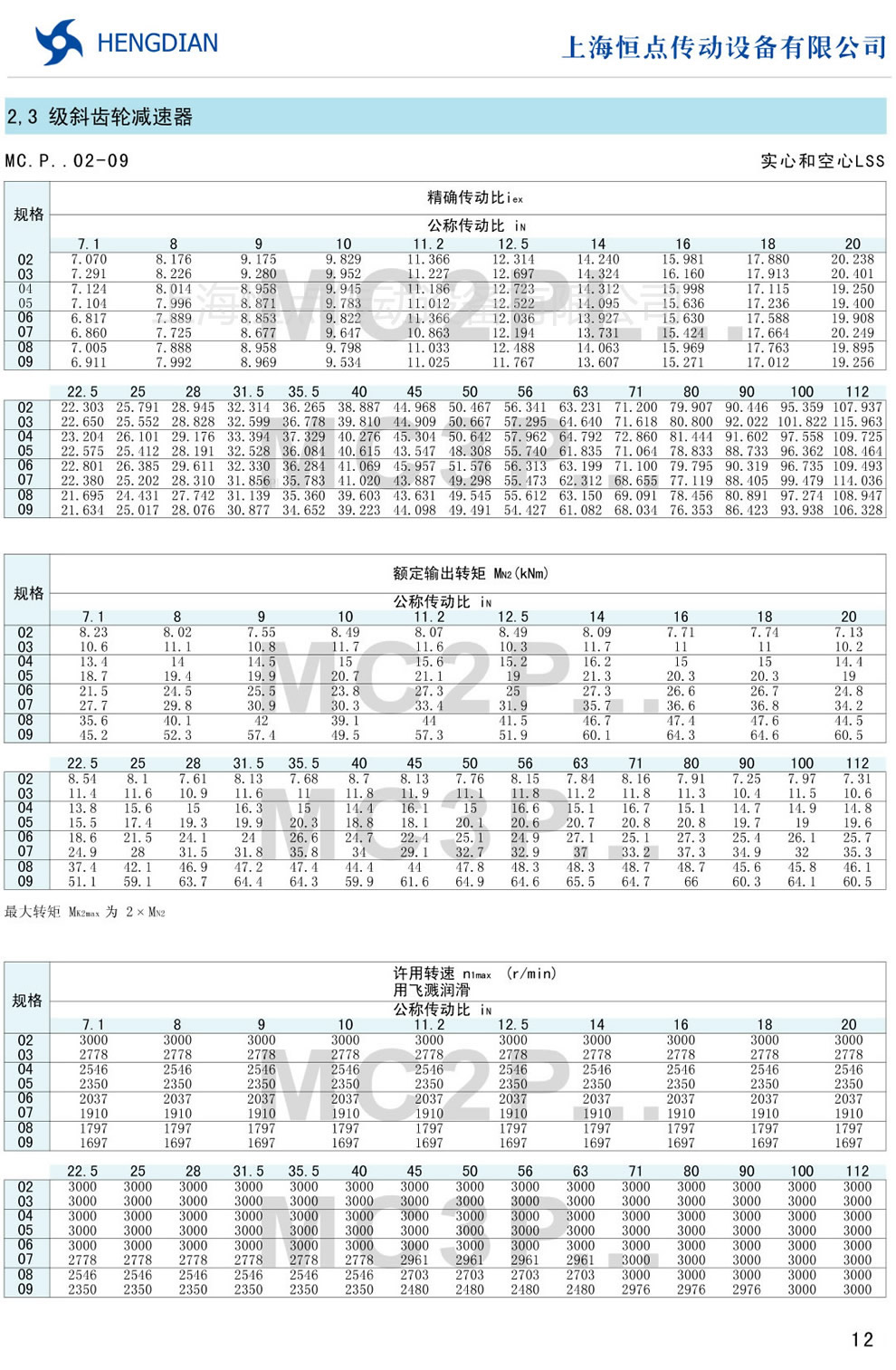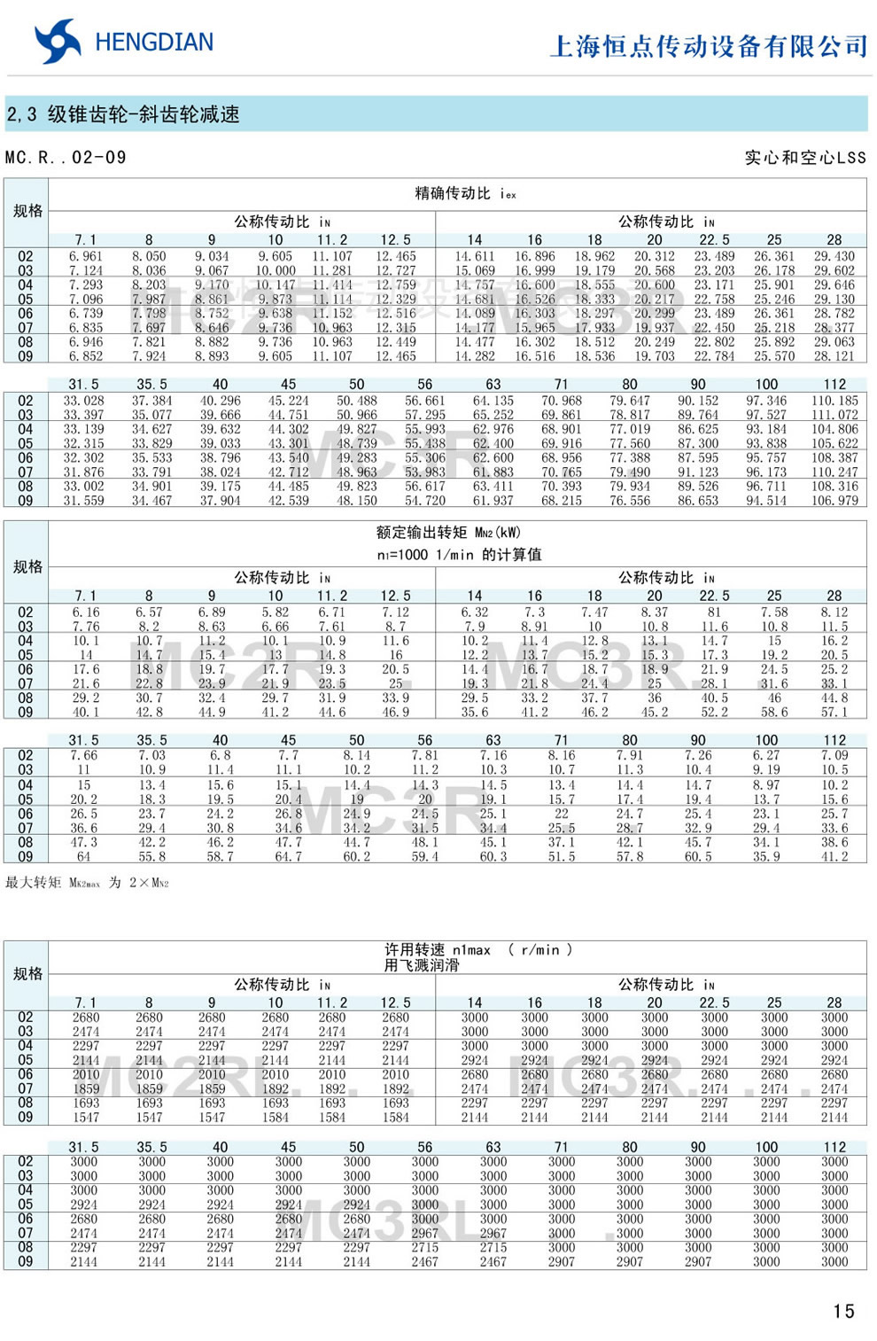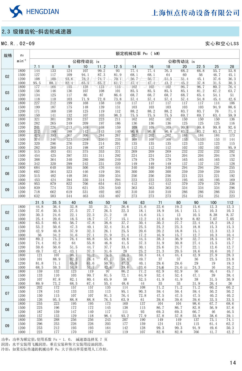 傳動能力表 - MC硬齒面減速器