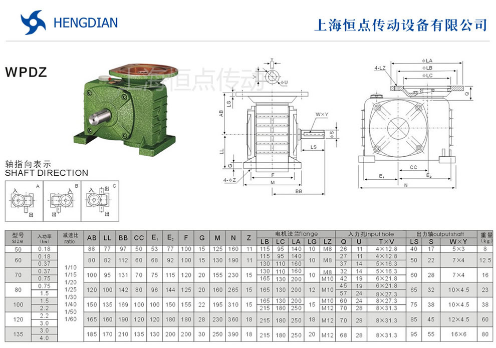 WPDZ減速機法蘭輸入,軸輸出.WPDZ減速機軸指向表示方法.機座号從50到135,可選速比從10到60.WPDZ系列蝸輪蝸杆減速機選型指南,WPDZ蝸輪蝸杆減速機的外形尺寸及安裝尺寸,